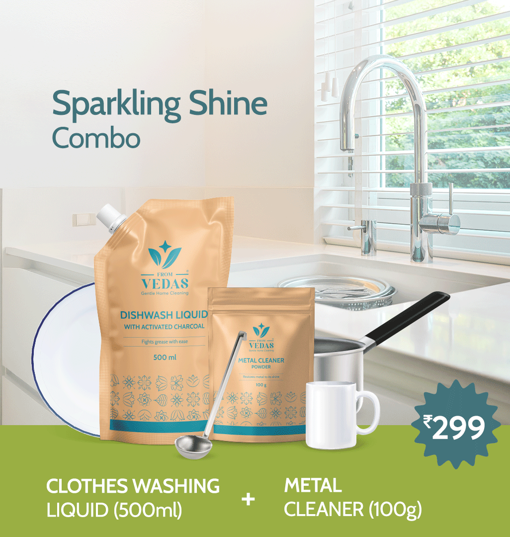 For spotless dishes and shining metals, the Sparkling Shine Combo contains one 500 ml pack of Dishwash Liquid, and one 100 gm pack of metal cleaner powder.